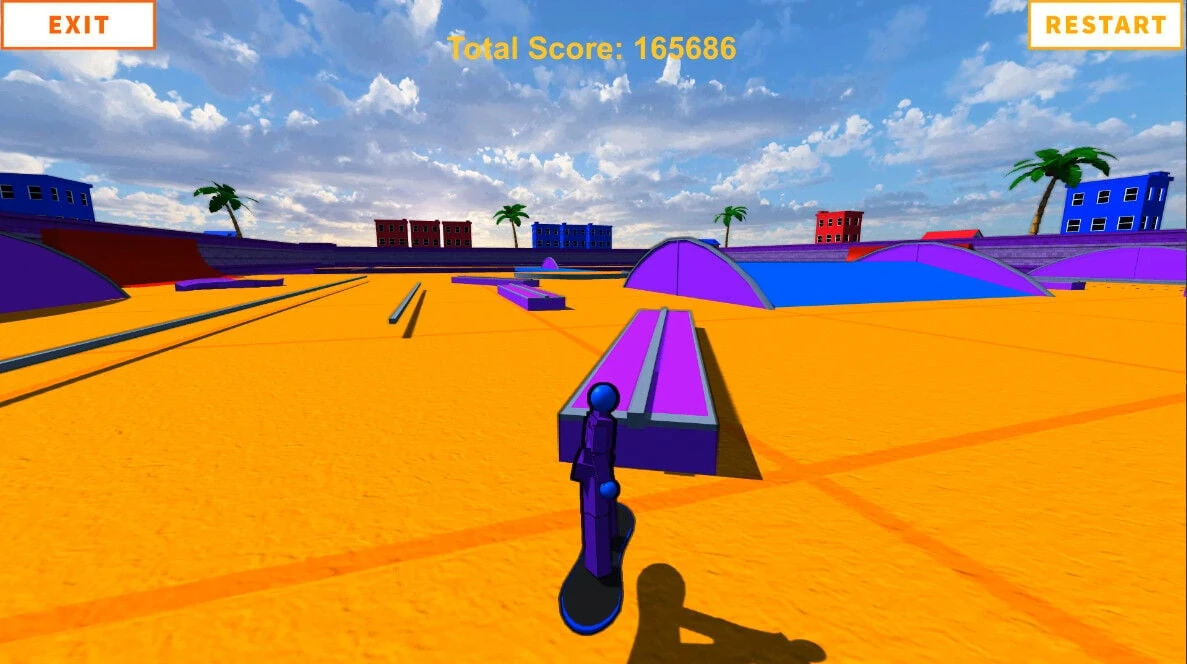 Simple gameplay: There are no objectives or unlockables, just freely move around on your hoverboard using traditional WASD movements. Hop on rails to automatically begin grinding, or head to the halfpipe and launch up in the air and perform rotations, flips and tricks. A score counter adds up all scores achieved in the same gameplay session.
